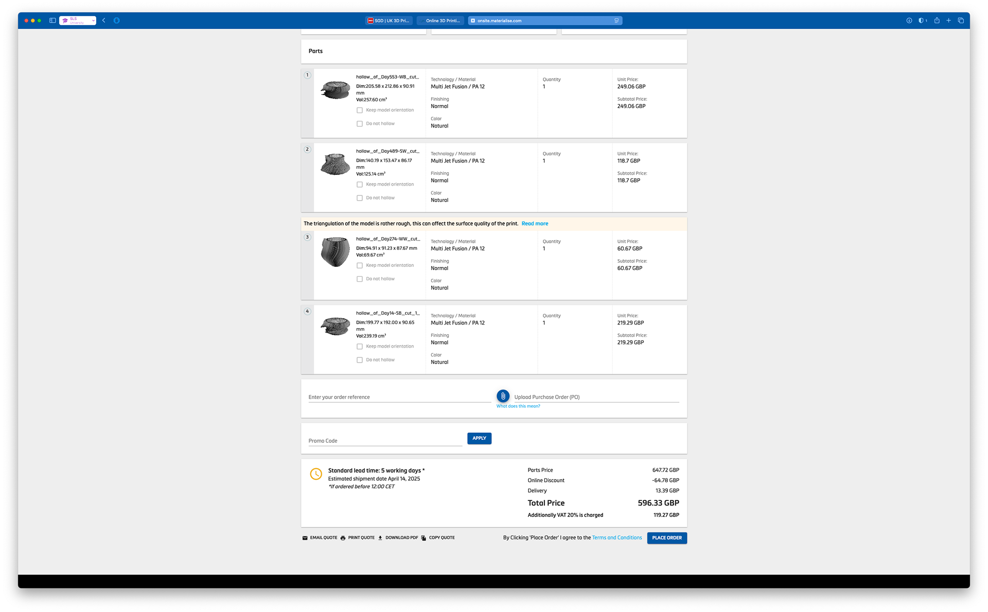Shipping is at standard rate, so I expect this cost even if I had only one of those parts printed.